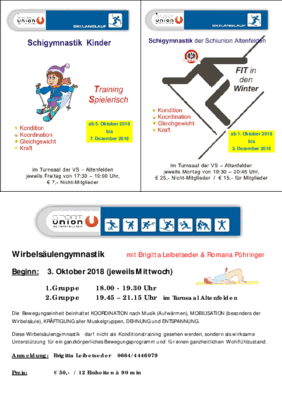 Schigymnastik für Erwachsene: 1. Oktober - 3. Dezember, immer montags von 19:30-20:45 Uhr. Kosten: €15,- für Mitglieder/€25,- für Nicht-Mitglieder