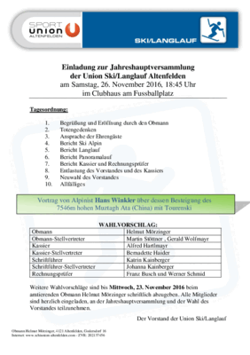 Einladung zur Jahreshauptversammlung der Union Ski/Langlauf Altenfelden am Samstag, 26. November 2016